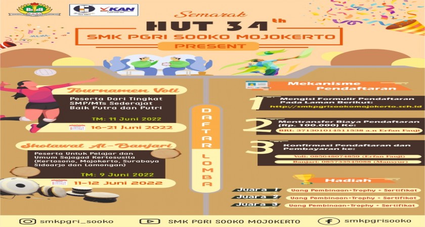 Memperingati Hari Ulang Tahun SMK PGRI SOOKO MOJOKERTO ke- 34 Tahun, semarak HUT mengadakan lomba voly dan sholawat AL - Banjari yang akan dilaksanakan pada bulan juni 2022. Peserta lomba dari tingkat SMP/MTS.