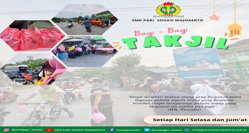 Dalam momentum bulan suci Ramadhan ini, Organisasi Siswa Intra Sekolah (OSIS) Sekolah Menengah Kejuruan (SMK) PGRI Sooko Mojokerto membagikan ratusan bungkus takjil buka puasa Ramadan 1443 Hijriah kepada warga yang melintas di Jalan Wijaya kusuma, Kecamatan Sooko, Sabtu (14/4/2022) sore.