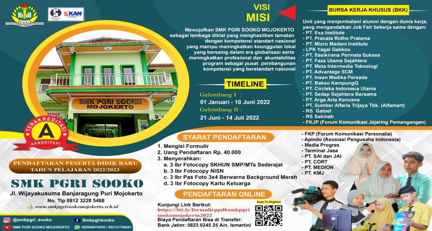 Penerimaan Peserta Didik Baru (PPDB ) SMK PGRI Sooko Mojokerto terakredtiasi "A" membuka pendaftaran peserta didik baru tahun pelajaran 2022/2023 memiliki 5 program keahlian (jurusan), antara lain: Akuntansi dan Keuangan Lembaga (AKL), Otomatisasi Tata Kelola Perkantoran (OTKP), Bisnis Daring dan Pemasaran (BDP), Tata Boga, Multimedia.