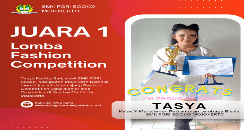 Tasya Kartika Sari, siswi kelas X jurusan Manajemen Perkantoran Lembaga Bisnis (MPLB) SMK PGRI Sooko ini menceritakan, awalnya dia mendapat informasi adanya Fashion Competition di Sunrise Mall pada 28 Januari 2024 ia pun bertekad untuk mengikuti lomba fashion tersebut. "Ya, nekad ikut fashion agar dapat pengalaman, alhamdulliah bisa menang," ungkapnya.